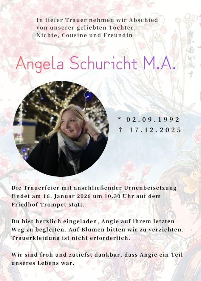 Auch ihre Freundinnen und Freunde kamen in ihren Cosplay-Kostümen. Bereits in der Einladung zur Trauerfeier hatte die Familie darum gebeten, gerne auf klassische Trauerkleidung zu verzichten. So entstand ein Bild, das nicht von Dunkelheit, sondern von Persönlichkeit und Zusammenhalt geprägt war. Selbst die Musikauswahl griff Angelas Anime-Leidenschaft auf und verlieh der Zeremonie eine ganz eigene und berührende Atmosphäre.