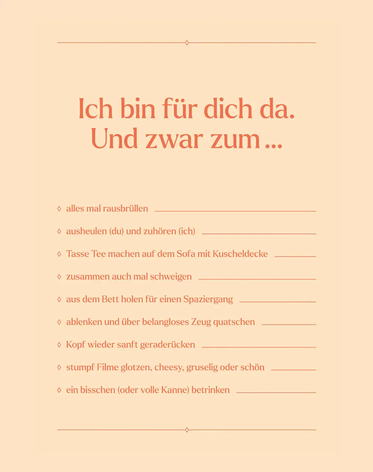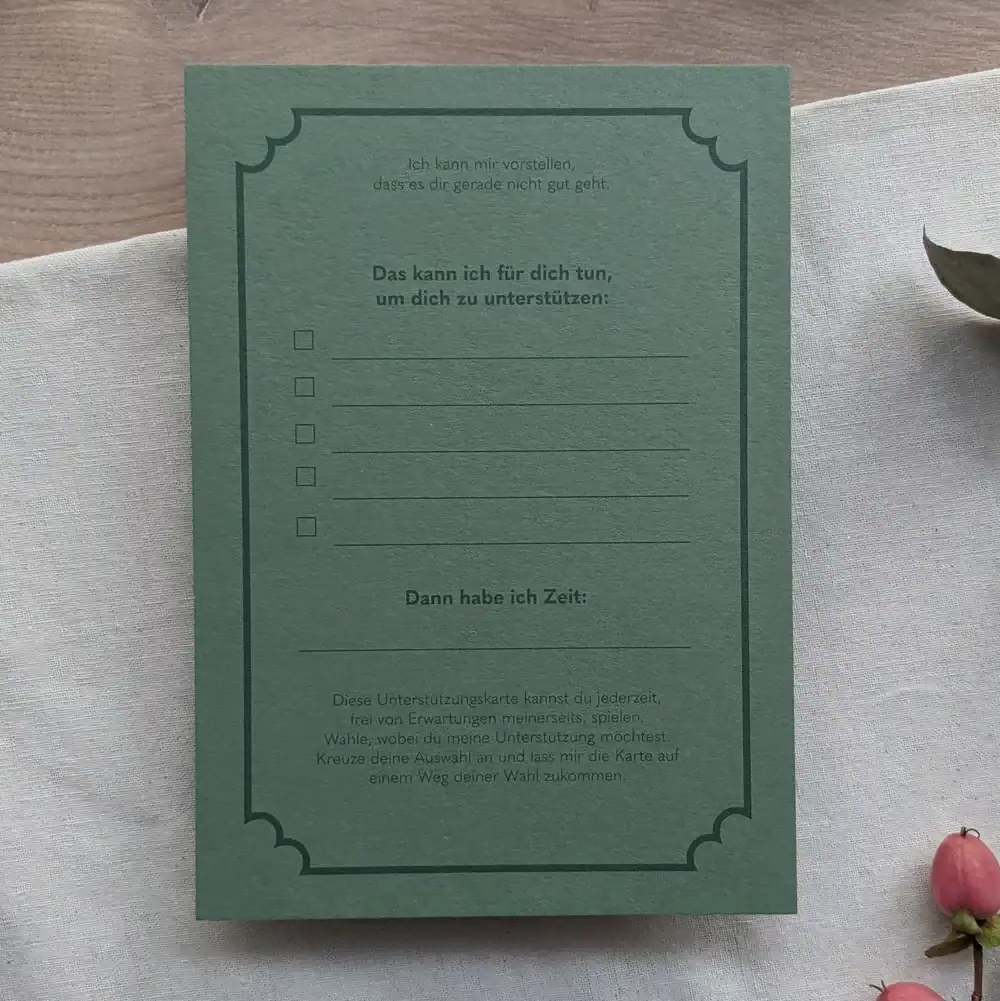 Mit der Unterstützungskarte oder der Karte zum Ankreuzen schenken Sie konkrete Handlungen, statt zu sagen „Melde Dich, wenn Du etwas brauchst“.